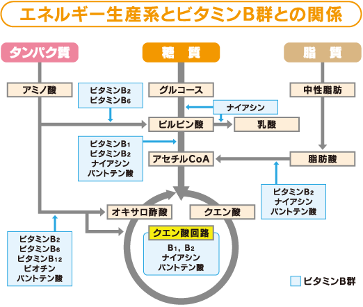 ビタミンB群は糖質・脂質・タンパク質からのエネルギー代謝に欠かせない補酵素として作用しています。